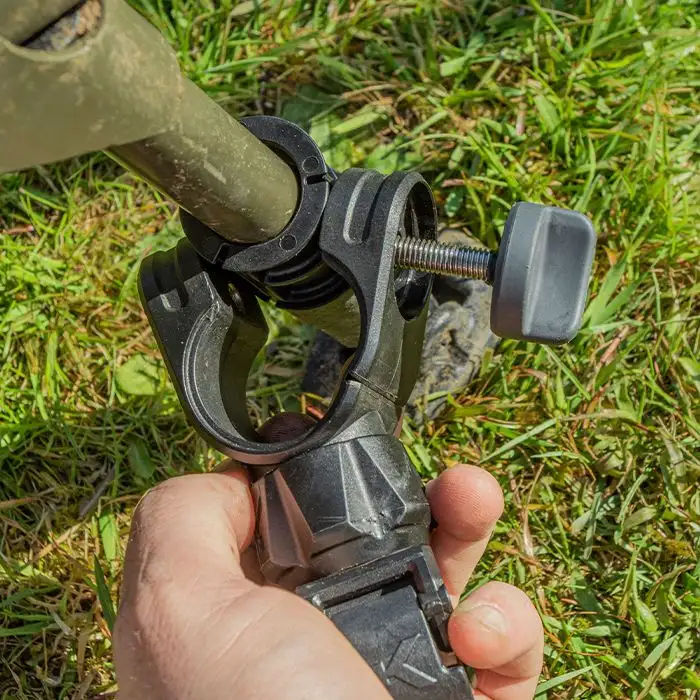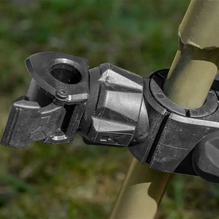 Um die Ablagen an Ihrem Stuhlbein zu befestigen, öffnen Sie einfach das Scharnier, setzen die mitgelieferten Einsätze hinein, um die beste Passform für Ihren Angelstuhl zu erreichen. Sie können den Winkel mit dem Handradsystem für die perfekte Einrichtung einstellen.