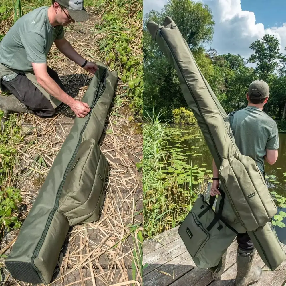 Ein völlig neues Konzept für Rutentaschen, das eine innovative neue Möglichkeit bietet, Ihre montierten Ruten und Rollen zusammen mit Ihren Schutzhüllen, Brollies und Zubehör zu transportieren. Das Fach für Ihre Ruten lässt sich vom hinteren Schutzfach wegklappen und bietet eienen zusätzlichen Rutenschutz. Es hat einen großzügigen gepolsterten Bereich, in dem drei Ruten und Rollen untergebracht werden können, sowie ein großes hinteres Fach, in das alle Korum-Schutzhüllen und Brollies passen. Außerdem gibt es eine einfache Außentasche für Netze, Kescherstäbe oder Banksticks.