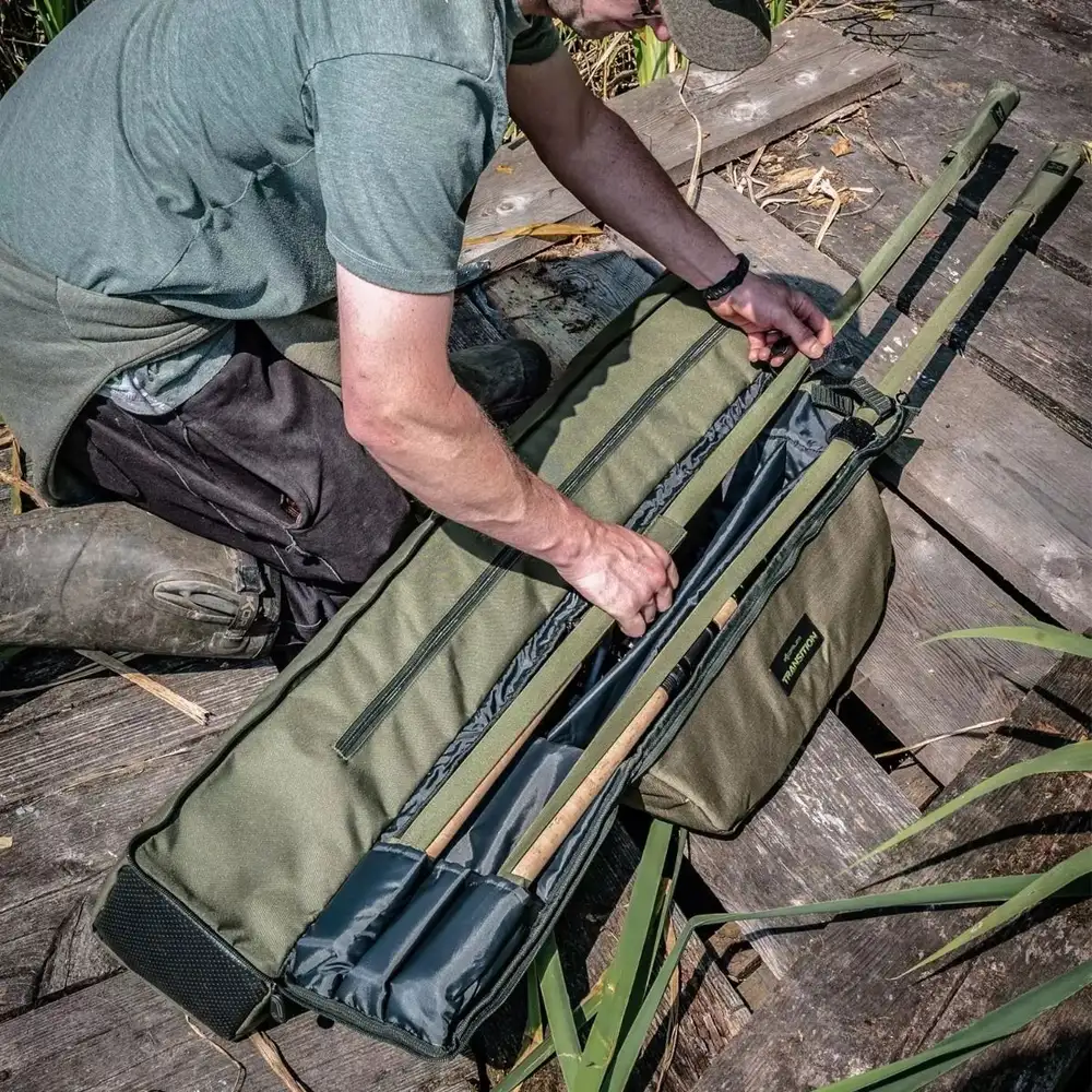 Ein völlig neues Konzept für Rutentaschen, das eine innovative neue Möglichkeit bietet, Ihre montierten Ruten und Rollen zusammen mit Ihren Schutzhüllen, Brollies und Zubehör zu transportieren. Das Fach für Ihre Ruten lässt sich vom hinteren Schutzfach wegklappen und bietet eienen zusätzlichen Rutenschutz. Es hat einen großzügigen gepolsterten Bereich, in dem drei Ruten und Rollen untergebracht werden können, sowie ein großes hinteres Fach, in das alle Korum-Schutzhüllen und Brollies passen. Außerdem gibt es eine einfache Außentasche für Netze, Kescherstäbe oder Banksticks.
