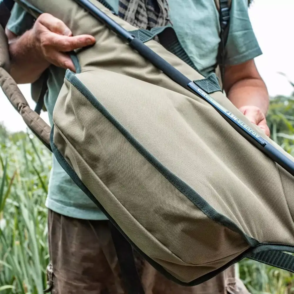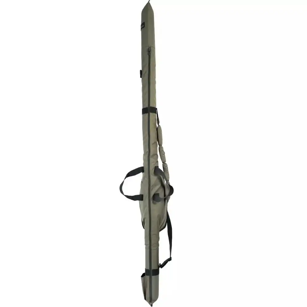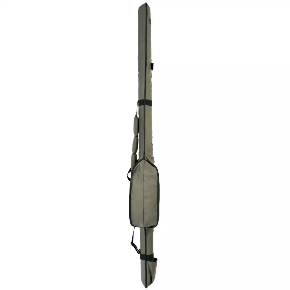 Diese einfache 2-Rutenhülse, ermöglicht die problemlose Lagerung von drei montierten Ruten. Sie enthält einen äußes Fach für zusätzliche Ruten oder Kescherstäbe. Der Tragegriff und der gepolsterte, verstellbare Schultergurt erleichtern das Tragen.